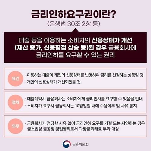 많은 분들이 '금리인하요구 신청요건'을 취업, 승진이 돼 연봉이 오르는 경우로만 알고 있는데요. 대출 등을 이용하는 소비자의 신용상태가 개선된 경우(재산 증가, 신용평점 상승 등) 금융회사에 금리인하를 요구할 수 있습니다.