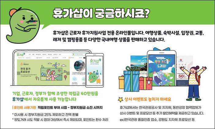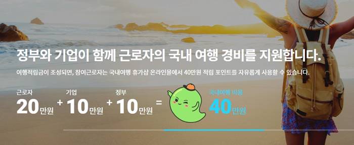 근로자가 20만 원을 적립하면 기업에서 10만 원, 정부에서 10만 원을 추가 적립해 총 40만 원의 국내여행 경비로 사용할 수 있도록 지원하는 제도입니다. 이 적립금은 40만 원 상당의 포인트로 전환돼 전용 온라인몰 '휴가샵' 및 전용 모바일앱에서 숙박, 교통, 관광지 입장권 등 국내 여행 관련 상품을 자유롭게 구매하는 데 활용할 수 있습니다.
