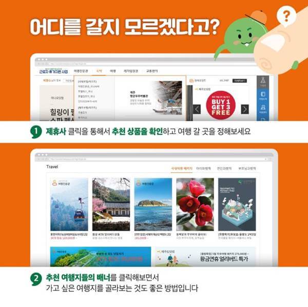 6. 휴가샵 온라인몰에서 국내 여행 관련 상품을 구입해 대한민국 구석구석으로 휴가를 떠납니다.