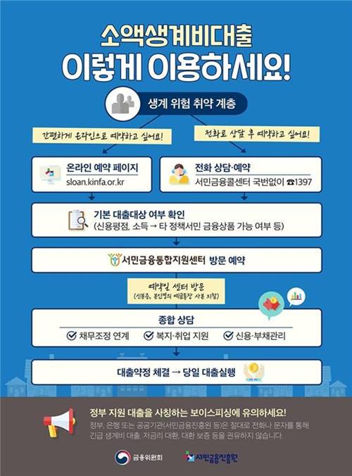 금융위원회는 최대 100만원까지 소액의 생계자금을 신청 당일 지원받을 수 있는 '소액생계비대출' 상품을 오는 3월 27일 출시합니다. 이는 '휴대폰깡', '내구제대출' 과 같은 '불법사금융' 피해에 노출될 수 있는 우려를 줄이기 위해 내놓은 정책상품으로, 최대 100만원 대출 시 월 이자는 1만3000원 수준이 될 것으로 보입니다.