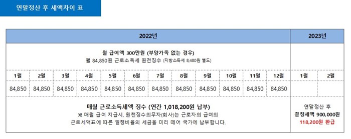 근로자가 매월 84,840원씩 근로소득세를 내서 연간 1,018,200원을 납부했는데, 연말정산을 통해 공제사항을 검토하고 계산하였더니 결정세액이 900,000원인 경우, 나라에서는 118,200원을 환급해주는 것입니다.