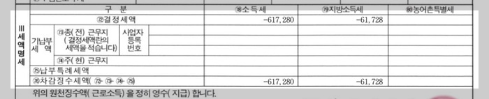 연말정산 완료된 후 전달받은 근로소득 원천징수영수증의 하단 " 76. 차감징수세액의 금액"이 + 이면 납부세액 발생, - 이면 환급세액이 발생한 것입니다