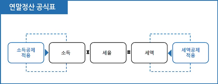 그렇다면, 가장 궁금한 부분은 "그래서 세금을 어떻게 줄일 수 있나요?"일 것입니다. 연말정산의 공식을 한번 살펴보겠습니다. 적용되는 소득공제, 세액공제가 크면 클수록 결정되는 세액이 작아지는 것을 알 수 있습니다.